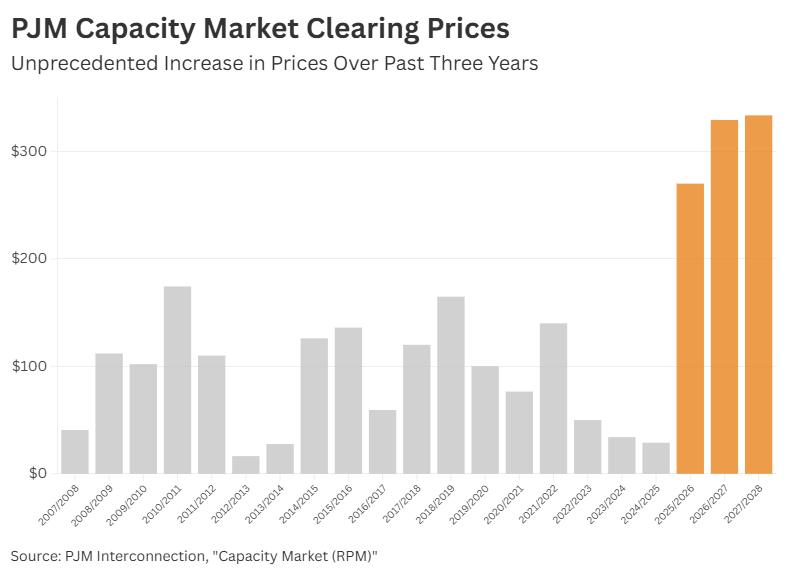 The big headline is a crisis in the PJM electricity market, the largest in the U.S., which coordinates power sales for all or parts of 13 states across the mid-Atlantic and much of the midwest to Chicago. In recent years, a combination of retirements of aging power plants and skyrocketing demand from new loads – especially data centers – has sent capacity market prices surging to previously unthinkable highs.